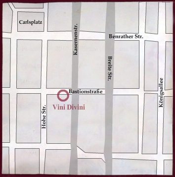 Nicht weit von Altstadt und Königsallee, im Herzen der Carlstadt liegt das romantische Vini Divini, das durch seine historische Lage und den im Sommer geöffneten Innenhof italienische Atmosphäre verspricht. Erreichbar mit den Bahnlinien 703/706/712/713/715 bis Haltestelle Benrather Straße und zu Fuß von Königsallee & Carlsplatz.